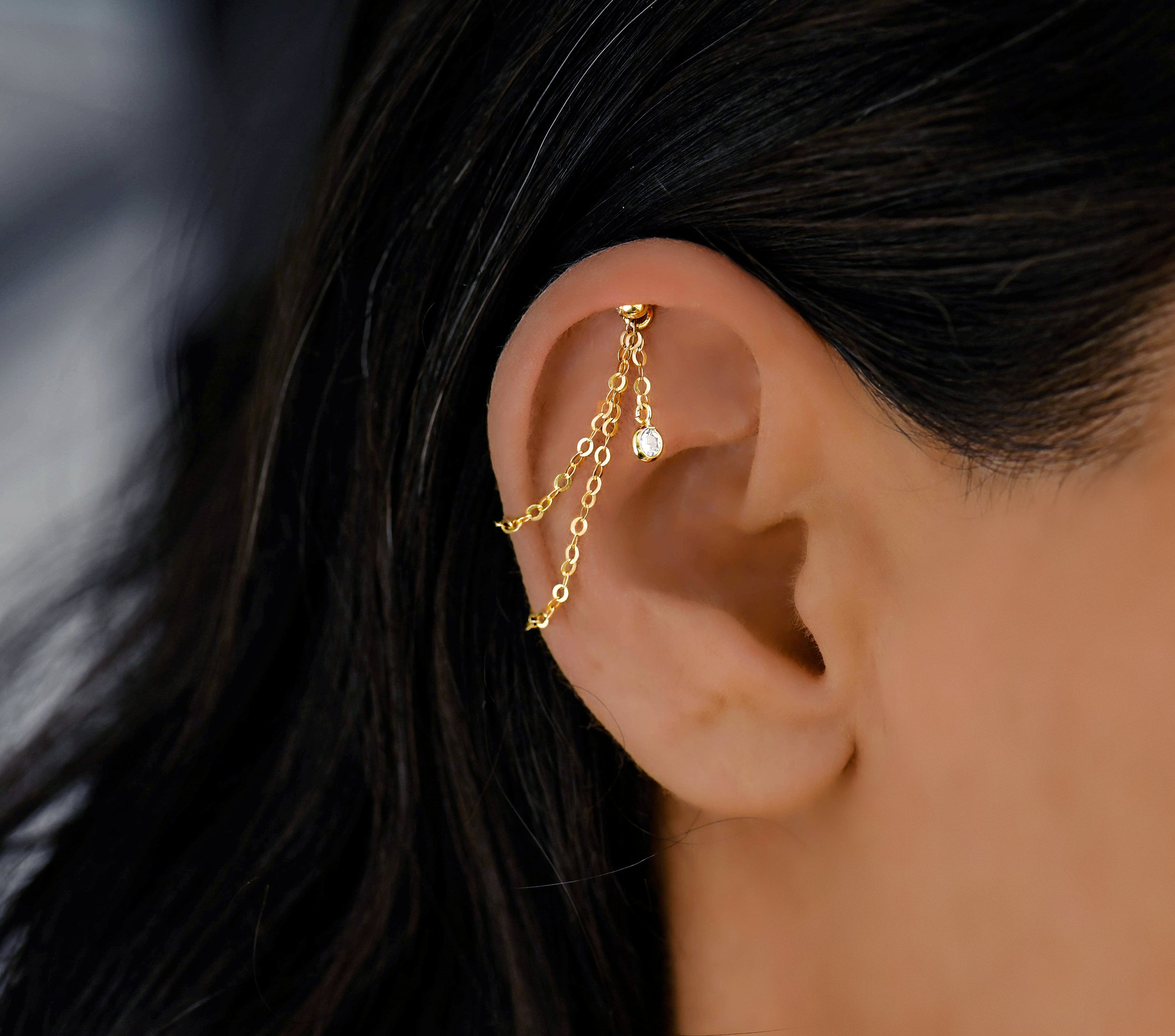 pierced earlobe with a triple helix in both ears; she generally wears studs & the occasional double helix chain